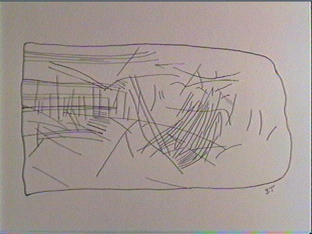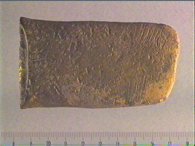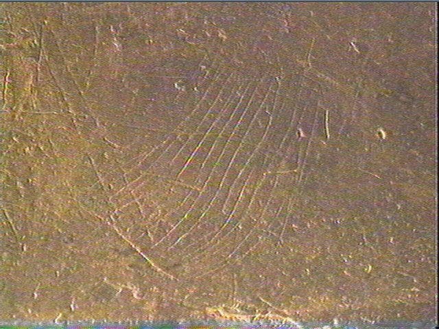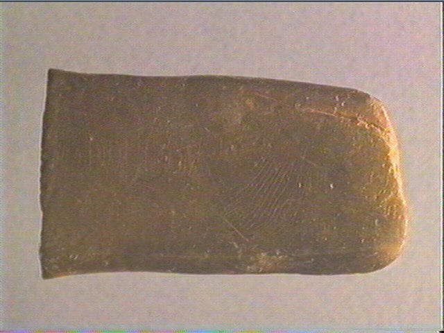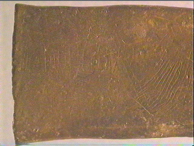Sur deux faces, nombreuses stries transversales et obliques alignées, traits entrecroisés, lignes courbes, formant un décor géométrique de type azilien