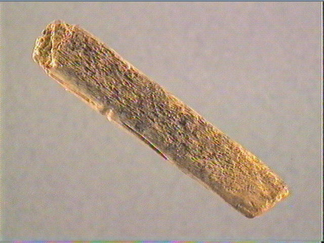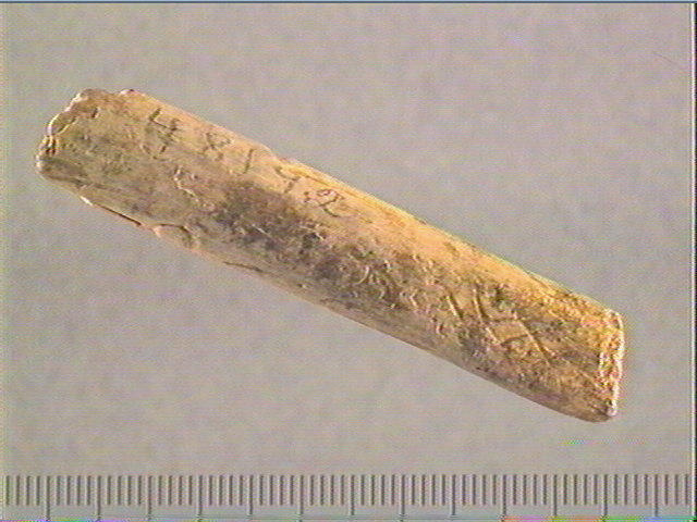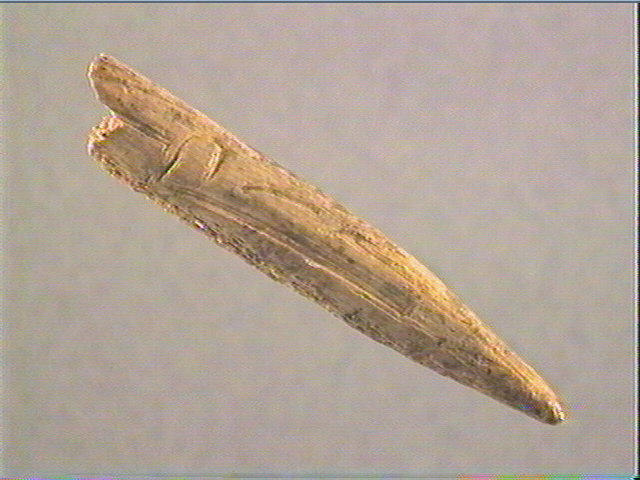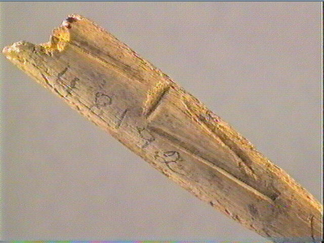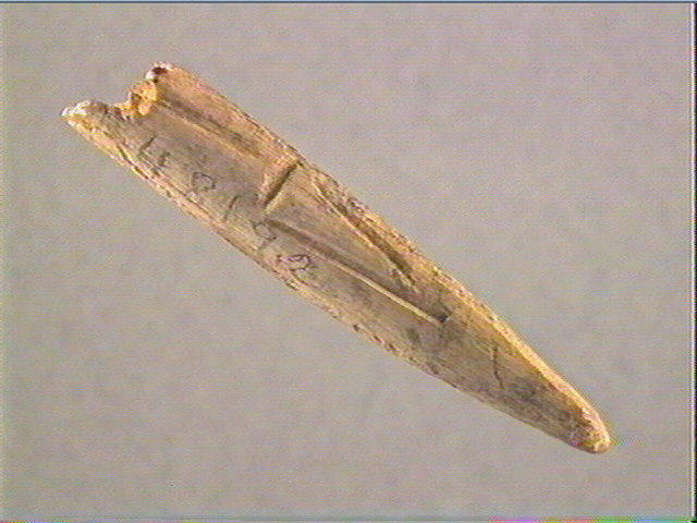 Sur un profil, un motif triangulaire, et au-dessus, une rainure longitudinale fracturée. Sur l'autre profil, un long motif fracturé, composé de plusieurs éléments : une rainure, des traits obliques et un motif plus ou moins ovalaire. Sur la face convexe, à une extrémité, un quadrillage