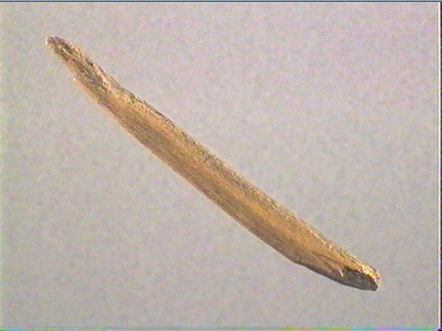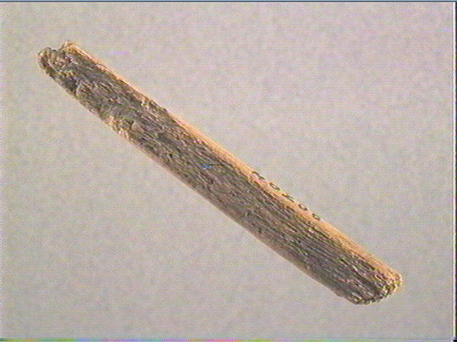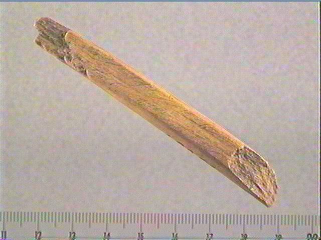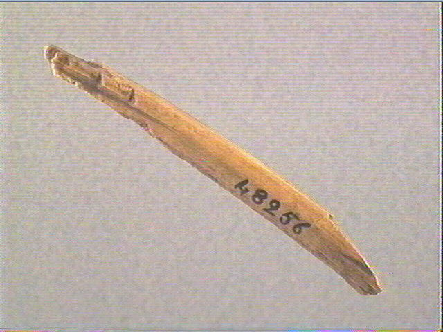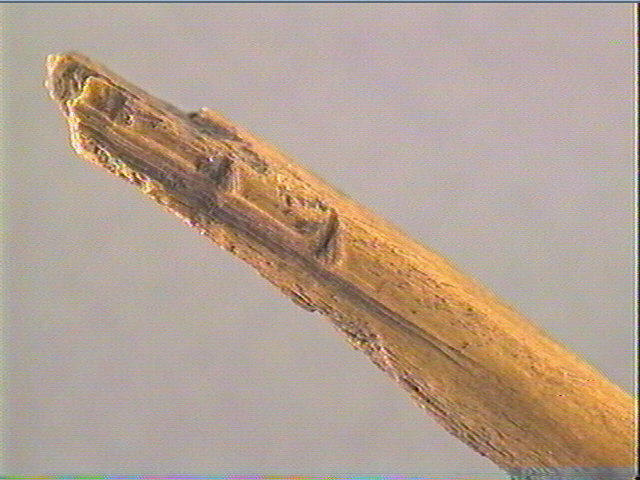 Sur la face supérieure, multiples stries obliques alignées, irrégulières. Sur un côté, un chevron fracturé à une extrémité, et à l'autre extrémité, une rainure longitudinale fracturée. Sur l'autre côté, à une extrémité, une rainure longitudinale fracturée ; à l'autre extrémité, une rainure longitudinale plus longue que la précédente, bordée de courtes entailles transversales