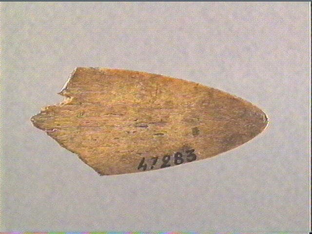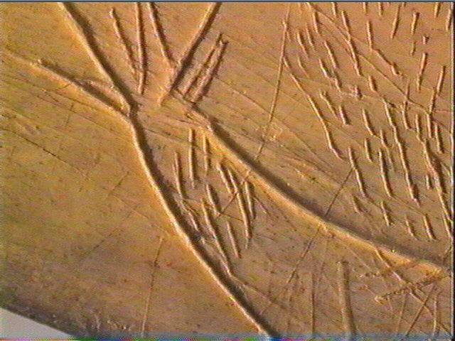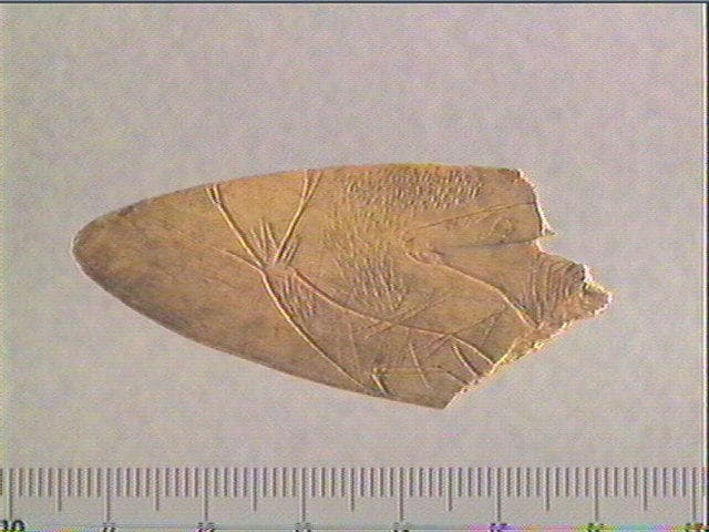 Sur une face, se trouve un cerf dont la tête est vue de dos, avec ses bois ramifiés et ses oreilles, et dont le corps est tourné sur la gauche. A sa droite, une tête d'animal indéterminée, vue de profil gauche et entourée d'un groupe de stries fines.