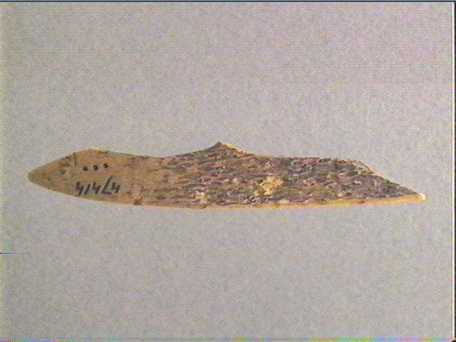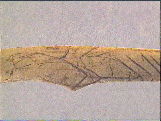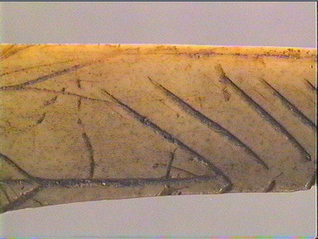 Incision fine, incision en v. Rangée de chevrons emboîtés en partie fracturés, et deux chevrons emboîtés à ligne médiane.