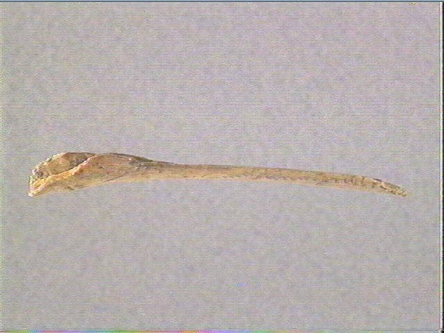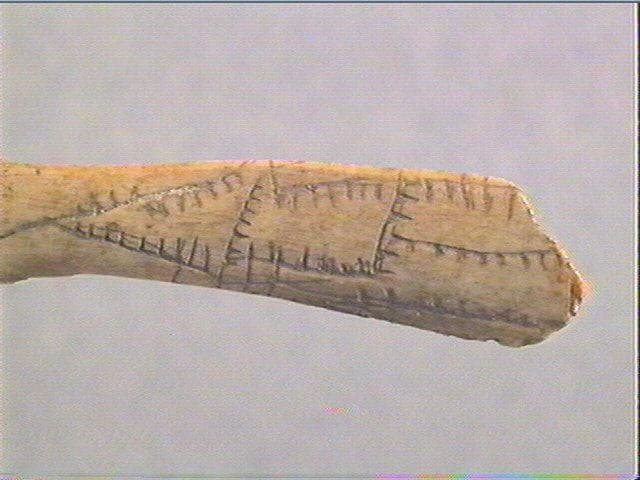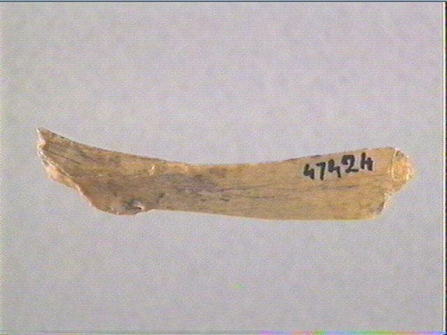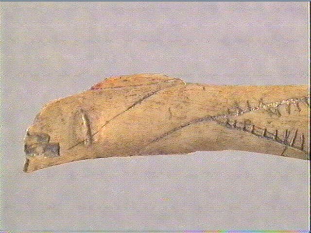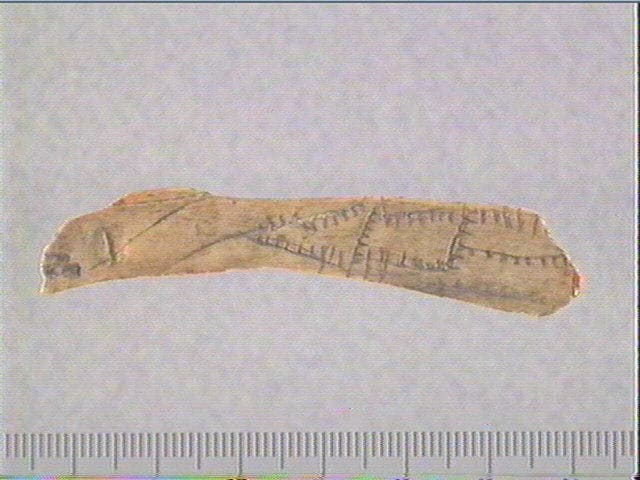 Incision en v. Sur une face, sont gravées trois figures géométriques fermées dont un triangle et un quadrilatère ; ces figures sont accolées et formées de lignes droites ou courbes pectinées.