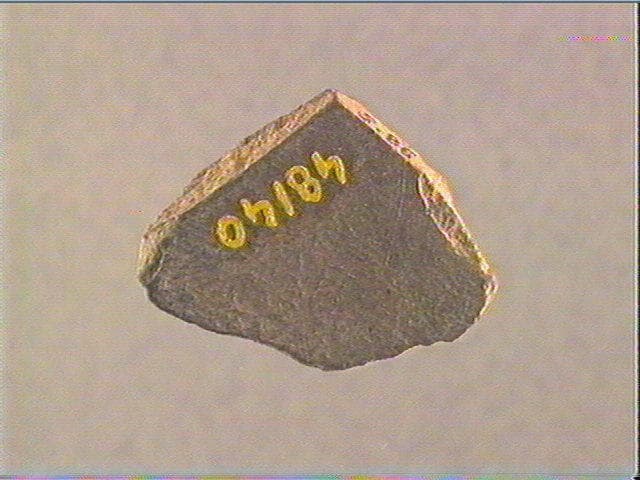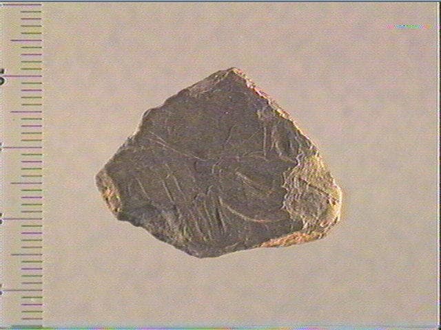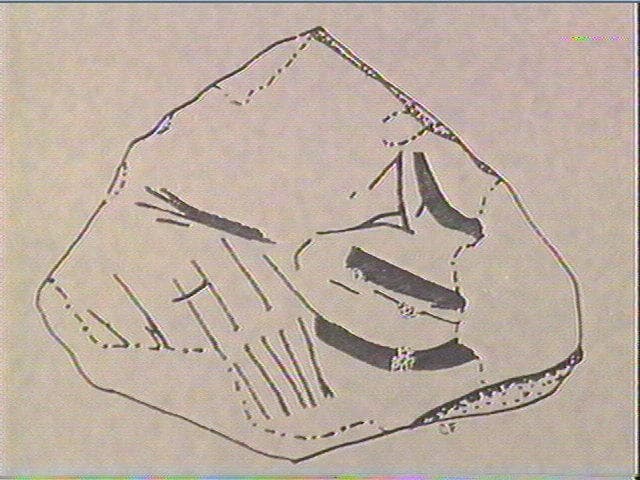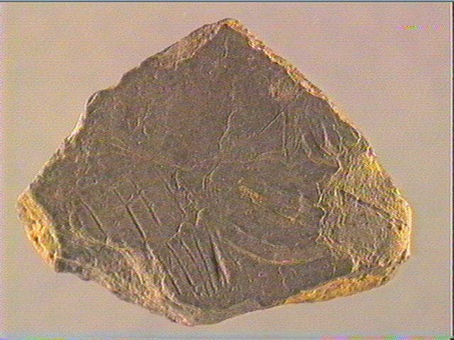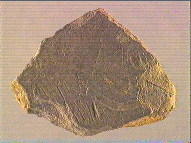 Incision fine, incision en v dissymétrique profonde. La plaquette est trop fragmentaire pour pouvoir déterminer ses tracés. Ils sont rectilignes ou courbes, les segments de la partie droite sont plus appuyés que les autres. Dans la partie gauche, peut-être une série de hachures assez fines