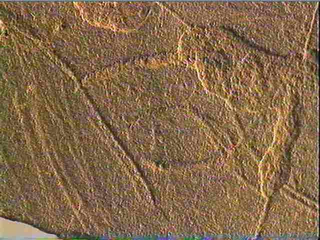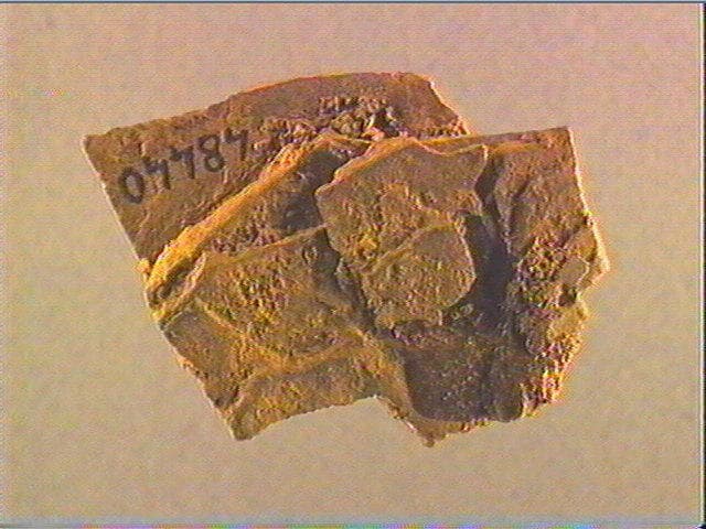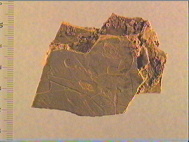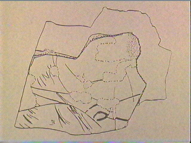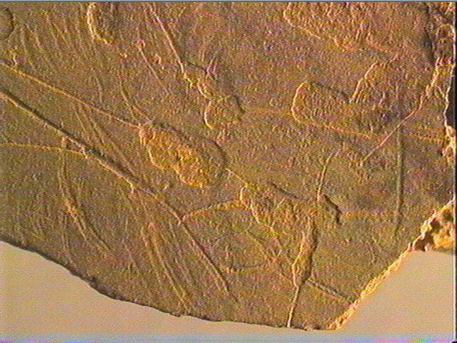 Incision fine, incision en v dissymétrique. Les gravures sont peu nombreuses, certains éléments organisés semblent se distinguer. Dans la partie droite de la pièce, une série de hachures est visible. Elle ne peut être rattachée à aucun élément particulier. Dans la partie inférieure gauche, une forme ovalaire ouverte peut faire penser à un oeil. Mis à part ces deux ensembles, les autres tracés sont rectilignes, sans organisation particulière