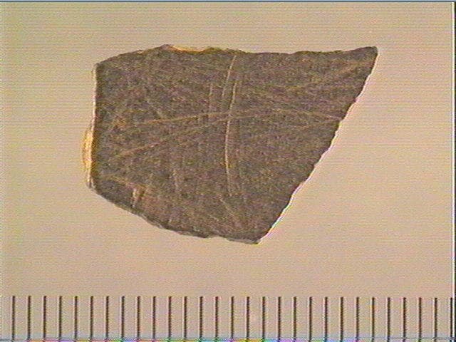 Incision fine, incision en v symétrique, incision en v dissymétrique. Les gravures sont peu nombreuses, mais bien lisibles. Dans la partie supérieure de la plaquette, nous distinguons des faisceaux de traits rectilignes verticaux, ainsi que quelques tracés courbes et rectilignes. Dans la partie inférieure droite, il semblerait qu'un trait rectiligne soit agrémenté d'au moins un chevron. Dans la partie inférieure gauche, nous discernons un demi-cercle qui est peut-être en liaison avec le tracé rectiligne qui semble lui être accolé