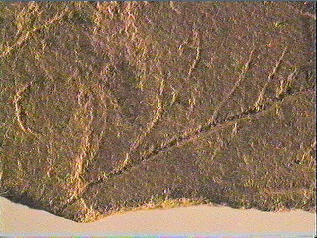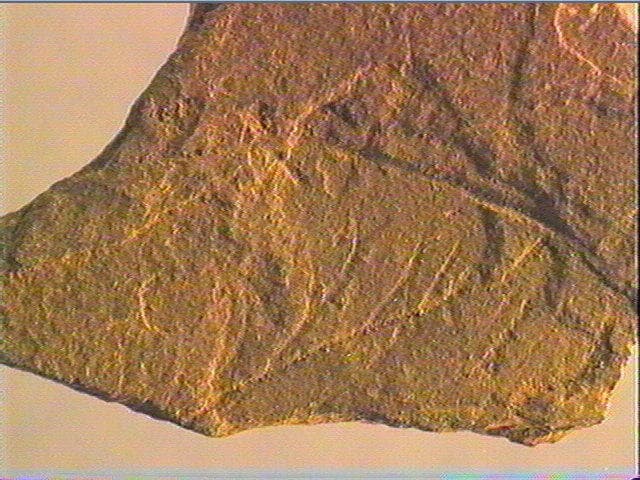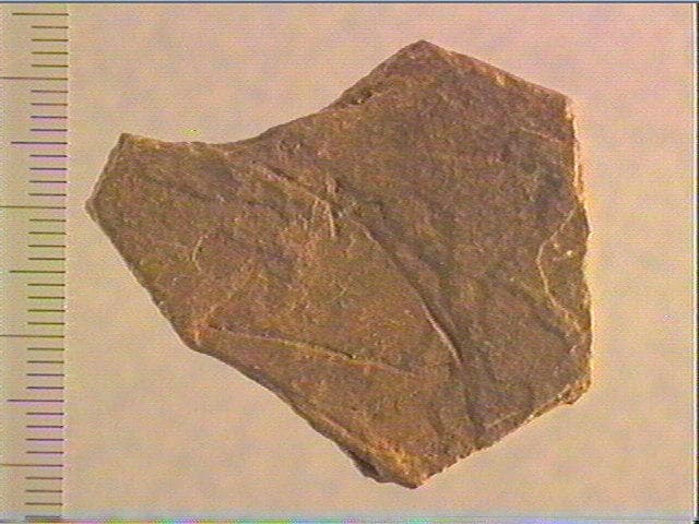 Incision en v symétrique profonde, incision en v dissymétrique profonde. Les gravures sont peu nombreuses; elles se situent dans la moitié gauche de la pièce.On distingue un tracé rectiligne où il semble que des traits courts, parfois ramifiés, viennent se greffer. L'état fragmentaire de la plaquette ne permet pas d'interpréter cet ensemble