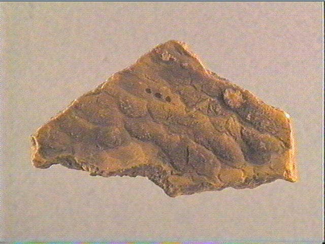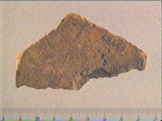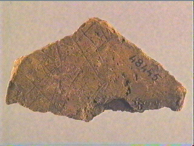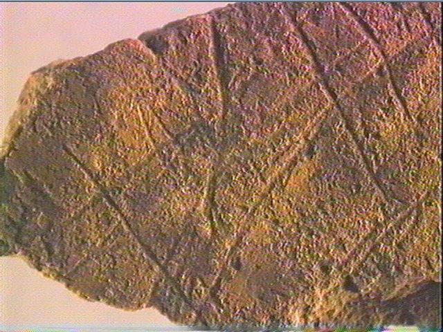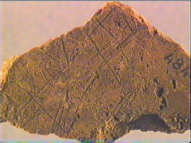Plancher stalagmitique. Incision en u large profonde, incision en v symétrique profonde, incision en v dissymétrique profonde. Les gravures sont peu nombreuses. Elles se situent dans les trois-quarts gauche de la plaquette et leur tracé est érodé. Les traits sont rectilignes ou légèrement courbes, verticaux ou horizontaux. Dans la partie supérieure de la plaquette, ils forment une sorte de grille