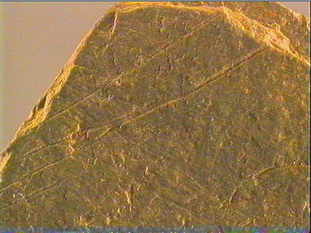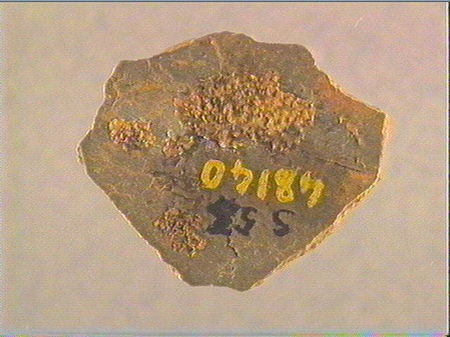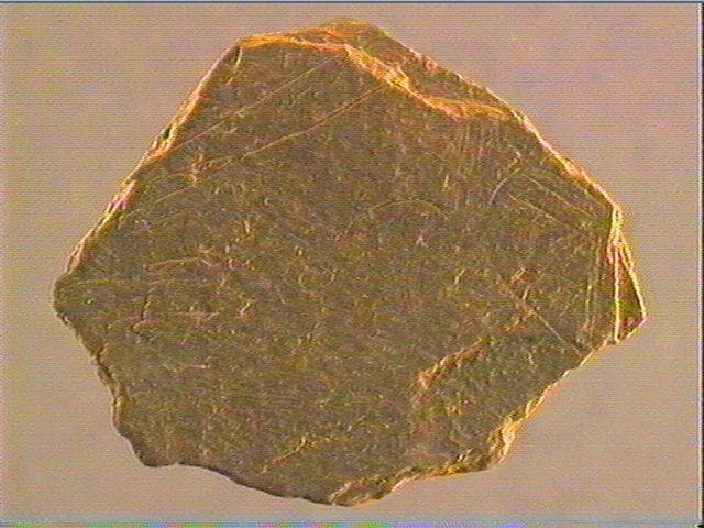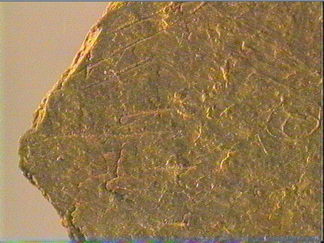 Incision fine, incision en v dissymétrique. Les gravures sont peu nombreuses. Elles sont constituées de tracés rectilignes ou courbes. On distingue, au centre et dans la partie gauche de la pièce, des formes circulaires souvent associées à un trait rectiligne. L'état fragmentaire de la plaquette ne permet pas d'interpréter cet ensemble