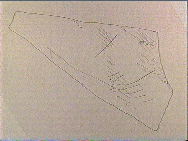Incision fine, incision en v dissymétrique. Les gravures sont peu nombreuses et essentiellement situées dans la partie gauche de la plaquette. On distingue des séries de hachures de traits obliques et parallèles, ainsi que des lignes ondulées ou verticales. Aucun élément figuratif ne peut être isolé