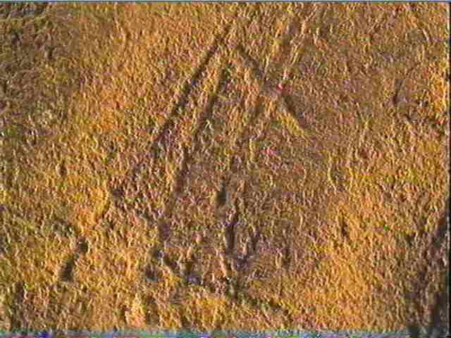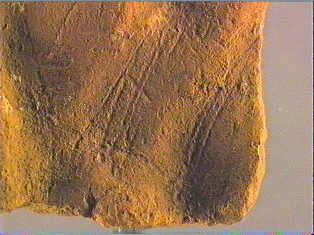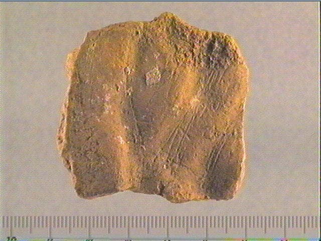 Plancher stalagmitique beige. Incision large, incision en v dissymétrique moyenne. Les gravures sont peu nombreuses. Elles sont constituées de faisceaux de traits axés principalement dans la longueur de la pièce