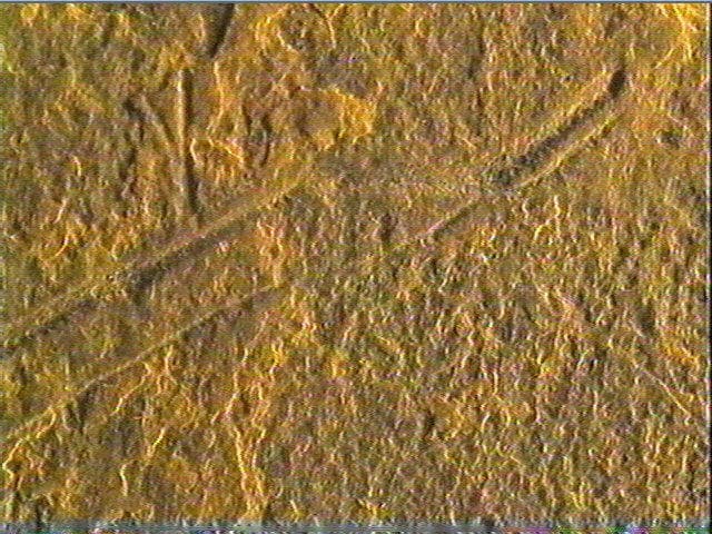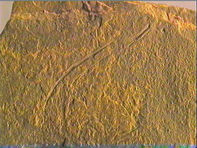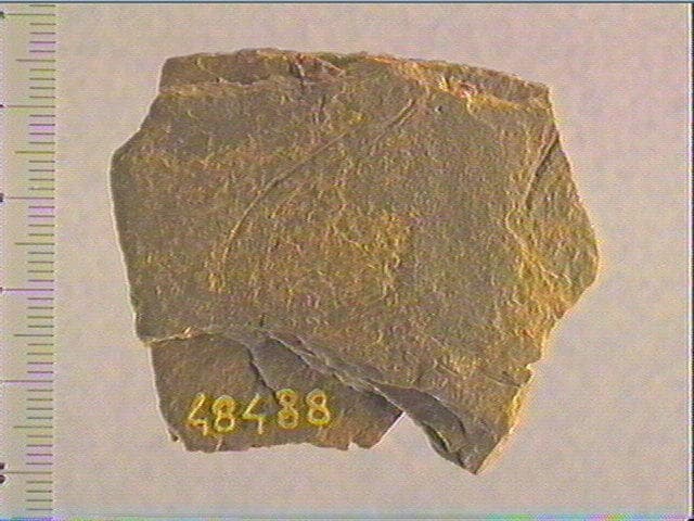 Incision fine, incision en v symétrique, incision en v dissymétrique. On ne discerne que quelques traits sans pouvoir les interpréter. Peut-être y a-t-il un chevron dans la partie supérieure ?