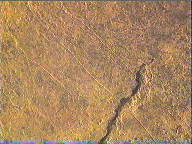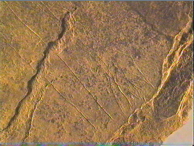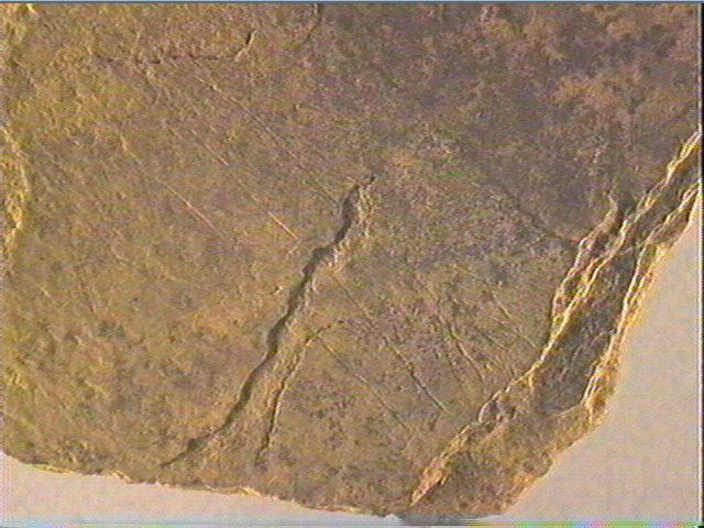 Incision fine, incision en v dissymétrique profonde. Les gravures sont peu nombreuses: ce sont de grands traits verticaux ou très légèrement ondulés qui traversent la plaquette dans la longueur. Au centre, on distingue une série de tirets obliques parallèles. Dans la partie droite, une série de traits rectilignes, perpendiculaires aux premiers'