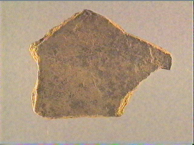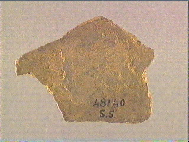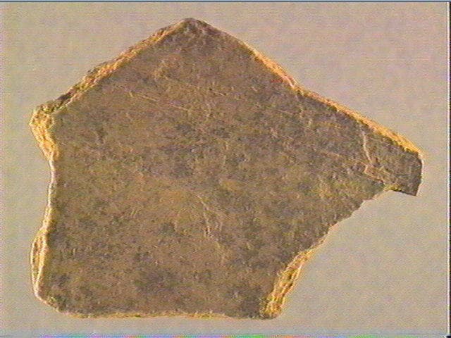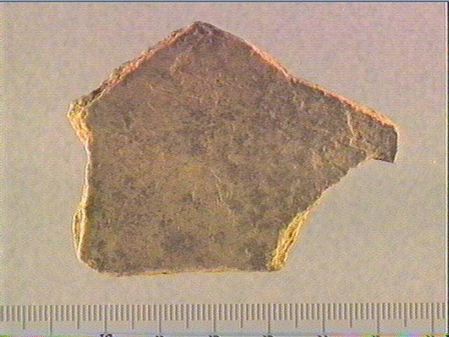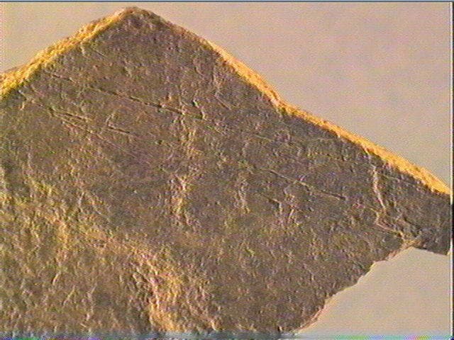 Incision fine, incision en v dissymétrique. Les tracés, peu nombreux, sont rectilignes et souvent ramifiés. Ils traversent la pièce dans sa largeur