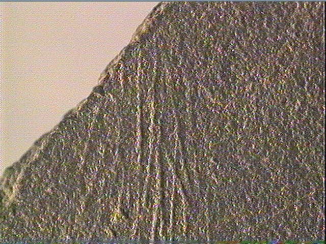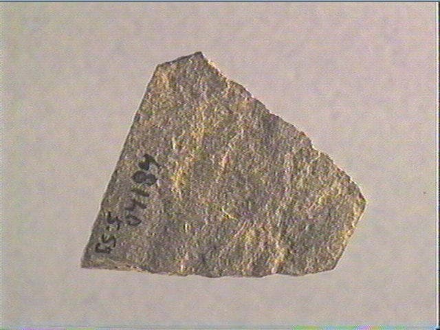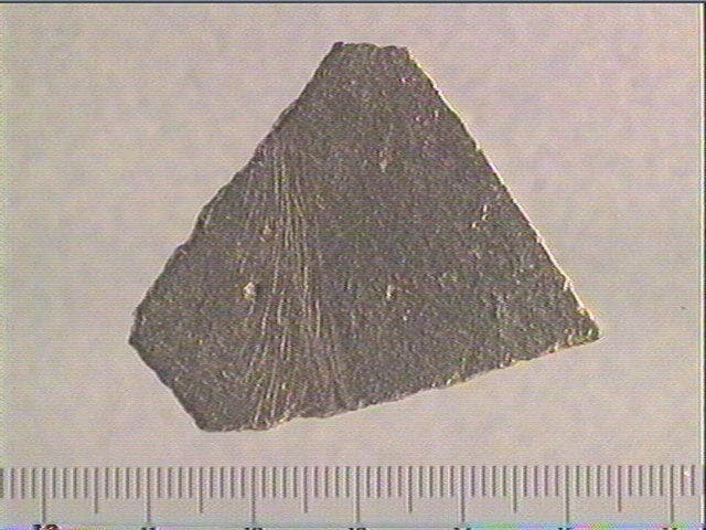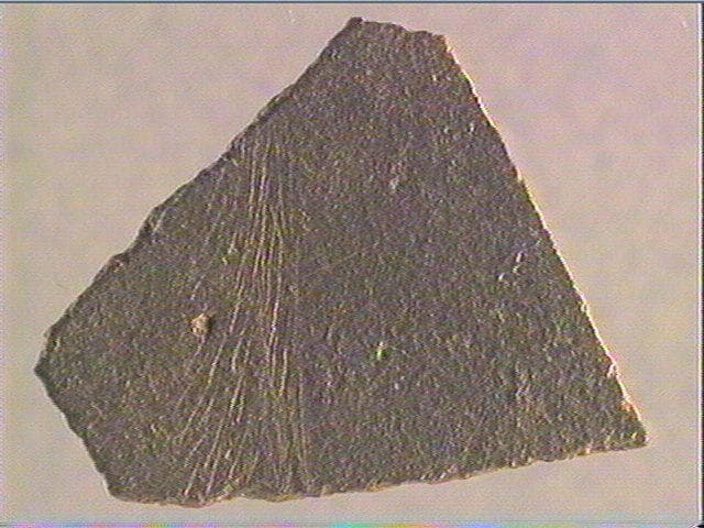 Incision fine, incision en v dissymétrique profonde, incision en v symétrique profonde. Les gravures sont peu nombreuses: elles traversent la pièce dans sa largeur. On peut distinguer des tirets et des traits registrés. Aucun élément figuratif n'est décelable