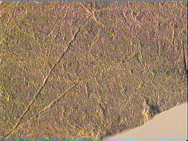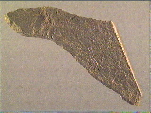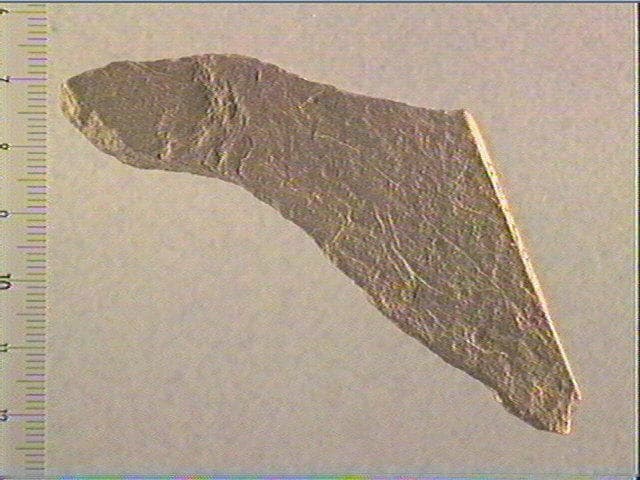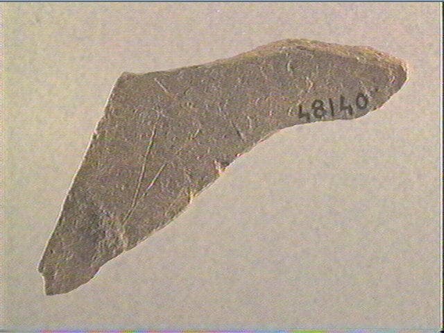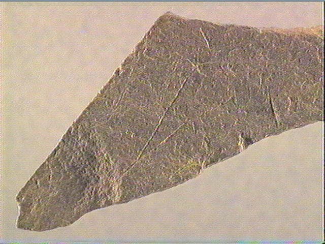 Incision fine, incision en v dissymétrique profonde. Au recto, les gravures sont peu nombreuses et se situent principalement au centre de la pièce. Les traits sont rectilignes ou courbes, parfois ramifiés. Une forme circulaire apparaît au centre. Au verso, quelques tracés rectilignes ou légèrement ondulés sont visibles dans la partie droite