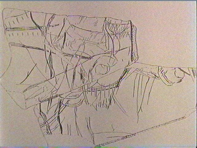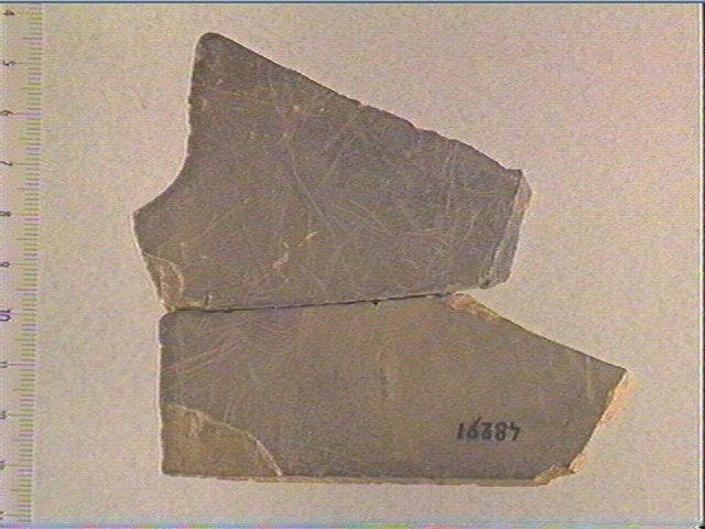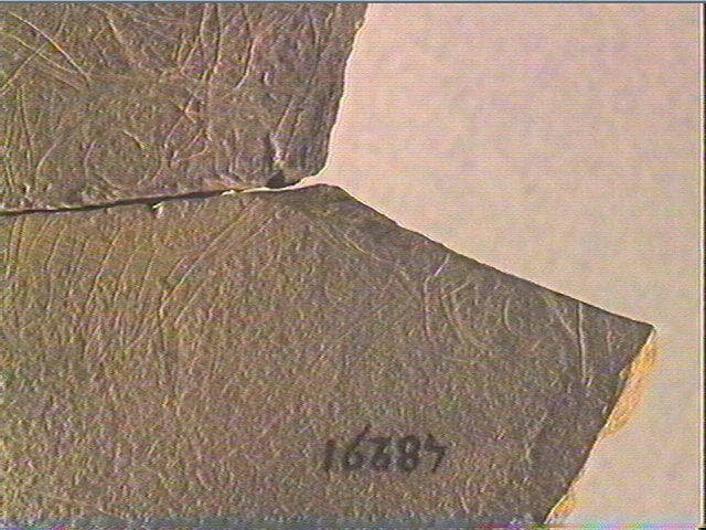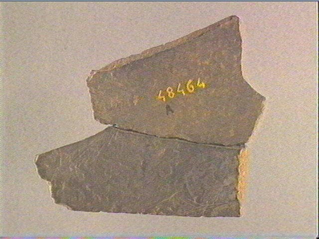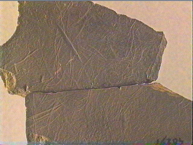 Incision fine, incision en v symétrique profonde, incision en v dissymétrique profonde. Les gravures à décrire sont nombreuses et lisibles. On distingue, dans la partie inférieure, le museau, le fanon, et le membre antérieur d'un renne de profil droit, dans la partie supérieure, la ligne du dos du renne, ainsi que le reste d'une tête d'animal indéterminé de profil gauche. Le renne : - la ligne dorsale est ondulée ; elle est représentée dans la partie supérieure de la plaquette - le museau est carré, avec une truffe semi-circulaire - la bouche est figurée par deux traits courbes, parallèles et discontinus ; la commissure des lèvres est figurée par deux traits verticaux - l'amorce du fanon se fait sous le menton ; il se poursuit jusqu'au membre antérieur; il est représenté en traits discontinus, courbes, quelque fois sur plusieurs registres ; il est hachuré sur toute sa longueur de traits verticaux plus ou moins parallèles et de longueurs différentes - le membre antérieur n'est qu'amorcé ; il est figuré en traits discontinus et légèrement courbes. Dans la partie supérieure de la pièce, on peut distinguer la tête de l'animal indéterminé, de profil gauche : - un chanfrein rectiligne - un oeil circulaire avec, dans sa partie supérieure, un ensemble de traits semi-circulaires. On ne retrouve pas, dans la partie inférieure de la plaquette, la continuité des tracés de la tête. De nombreux traits restent indéterminés. Il est toutefois possible d'isoler quelques ensembles : - dans la partie supérieure de la plaquette, des groupes de tirets verticaux parallèles semblent organisés - au dessus de l'oeil de l'animal indéterminé, une forme ondulée, terminée dans sa partie supérieure par des tirets verticaux, semble former un élément construit. Au verso, des traits semblent essentiellement regroupés dans la partie inférieure de la pièce, sur ses deux extrémités. On distingue des ensembles de hachures et de traits discontinus qui restent indéterminés. La succession chronologique des divers éléments n'est pas repérable. L'état fragmentaire de la plaquette empêche de visualiser le chevauchement des tracés
