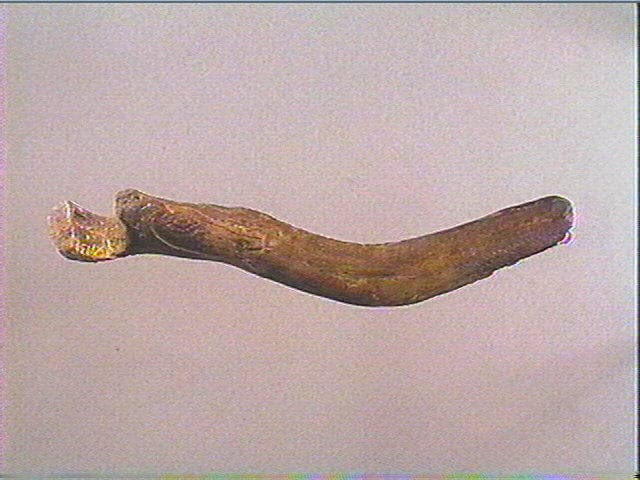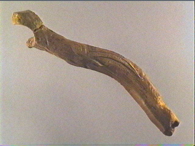 Perforation dans la partie basilaire du bois. Le bâton percé appartenait peut être au type 'sans branches'. Cat 84 d' 'L'art préhistorique des Pyrénées'. Il s'agit d'un bâton percé dont la perforation a été aménagée au niveau de la partie basilaire du bois. Il appartenait peut-être au type 'sans branches' mais une fracturation ayant endommagé la partie distale perforée, il n'est pas possible de conclure. Le manche est orné au niveau de la partie mésiale de deux magnifiques têtes de bouquetin. Une face porte un profil -