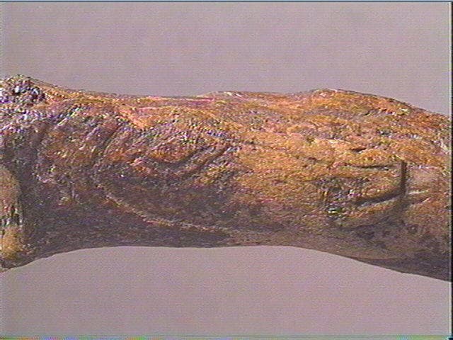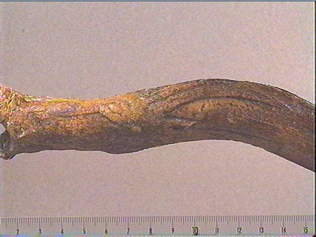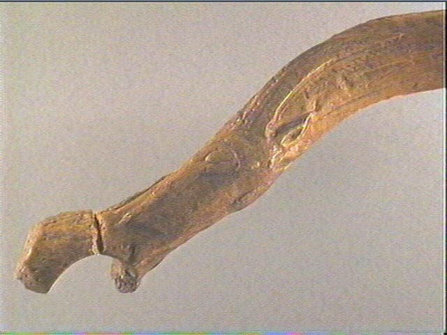 gauche traité en champlevé et doté de nombreux détails anatomiques. Le museau, la barbiche et une oreille pointue sont figurés. Le naseau est marqué par une légère incision et l'oeil en relief est également détaillé. Des lignes de ponctuations et des séries de hachures pourraient représenter le pelage. La corne courbe et relativement longue est complexe, ornée d'une bande hachurée obliquement, soulignant un registre en relief gravé sur toute sa longueur d'une ligne barbelée. Cette organisation graphique peut suggérer les aspérités et les anneaux si caractéristiques des cornes du bouquetin. L'autre face est ornée d'un profil droit, aussi bien figuré que le précédent mais avec une corne repliée, revenant vers l'avant le long de la joue. De plus, ce bouquetin est représenté la langue sortie. Du fait de la courbure de sa corne, cet animal a parfois été identifié à un ovibos, espèce très rarement figurée par les magdaléniens, mais la plupart des préhistoriens pensent que la courbure n'est pas anatomique masi serait due à la contrainte du support liée à la perforation. La partie proximale du manche est légèrement endommagée mais ce ne nous empêche pas d'observer sur toutes les faces des décors composés de séries d'incisions obliques, simples ou doubles et de longueur variée, formant des bandes parallèles.