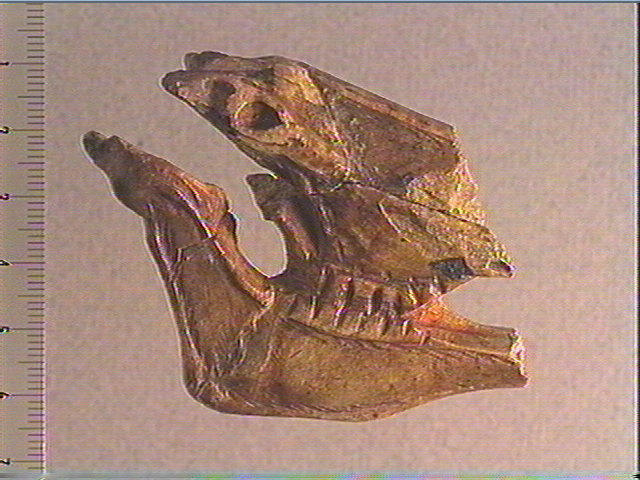 Colorant rouge à base d'hématite et de feldspath. ; Tête 'écorchée' ossseuse de cheval, sculptée et gravée : crâne, chanfrein, oeil en creux, joue, maxillaire, dents, ganache et figuration du pelage. La positionde l'orbite et le volume de la boîte cranienne sont bien respectés. Des traits gravés soulignent les volumes et les creux et sont accompagnés d'un décor géométrique peu visible : ligne en zigzag sur le front, angles emboîtés sur la mâchoire (profil gauche). Thème du cheval mort.