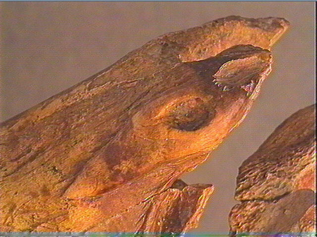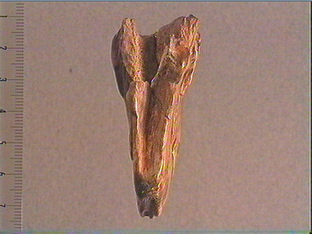 Incision en v dissymétrique. Colorant rouge à base d'hématite et de feldspath. ; Tête 'écorchée' ossseuse de cheval, sculptée et gravée : crâne, chanfrein, oeil en creux, joue, maxillaire, dents, ganache et figuration du pelage. La positionde l'orbite et le volume de la boîte cranienne sont bien respectés. Des traits gravés soulignent les volumes et les creux et sont accompagnés d'un décor géométrique peu visible : ligne en zigzag sur le front, angles emboîtés sur la mâchoire (profil gauche). Thème du cheval mort.
