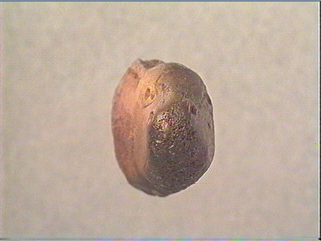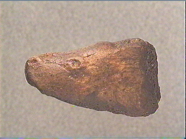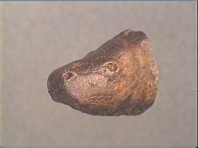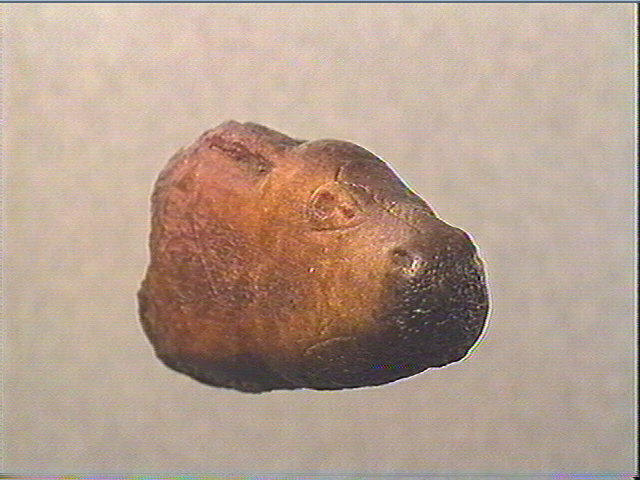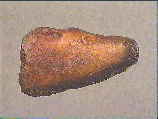 Incision fine, incision moyenne. Tête d'un animal, sculptée et gravée, avec les oreilles, le front bombé, l'oeil en amande, le chanfrein, le museau, et une série de chevrons alignés.