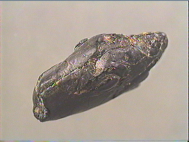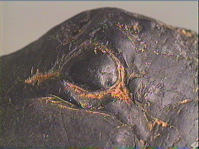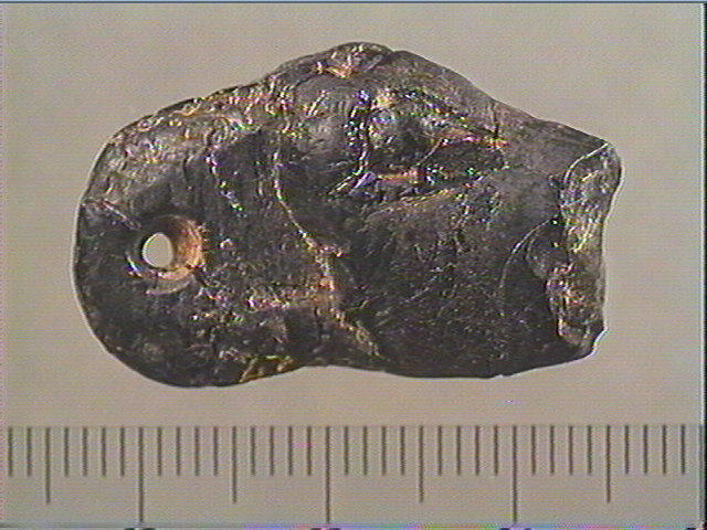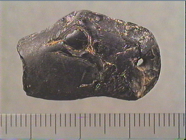 Jais ou lignite noir ; Tête d'animal sculptée et gravée : oeil en amande, museau, front, cou. Incision en v dissymétrique.