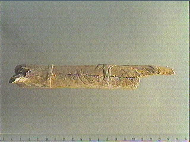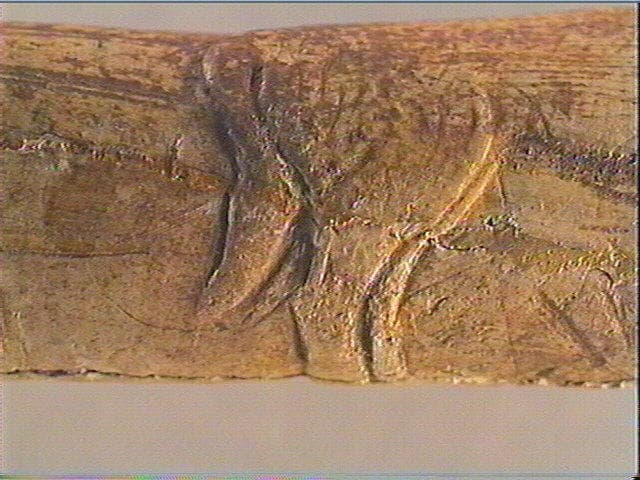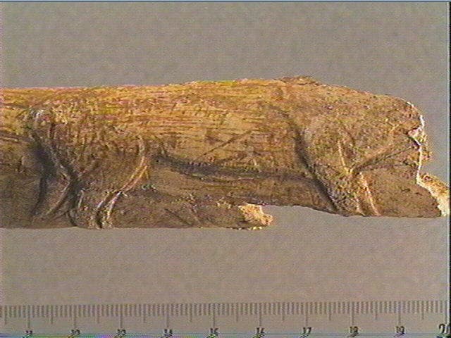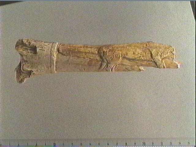 Incision en v dissymétrique, incision profonde, incision large. Peut-être un bovidé sculpté en relief et gravé : profil droit, poitrail, pattes antérieures, abdomen, pattes postérieures, queue longue. Derrière l'animal : trois lignes longitudinales, puis un anneau circulaire en relief. Entourant les pattes postérieures de l'animal : 2 groupes de 3 stries obliques parallèles.