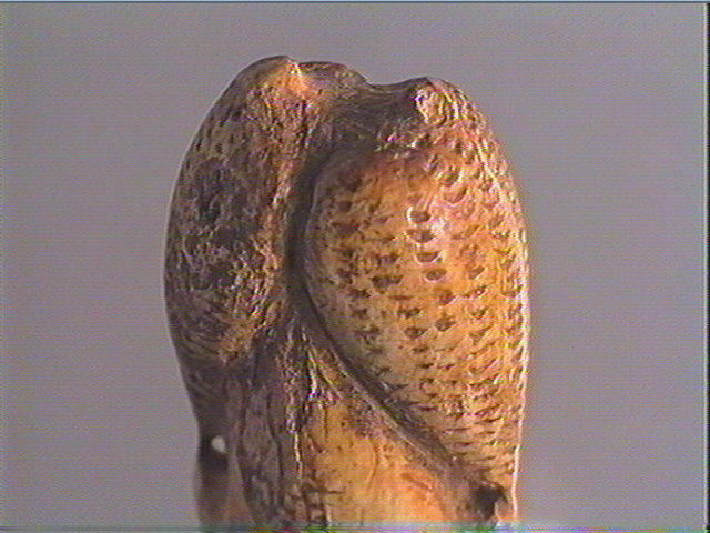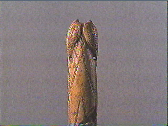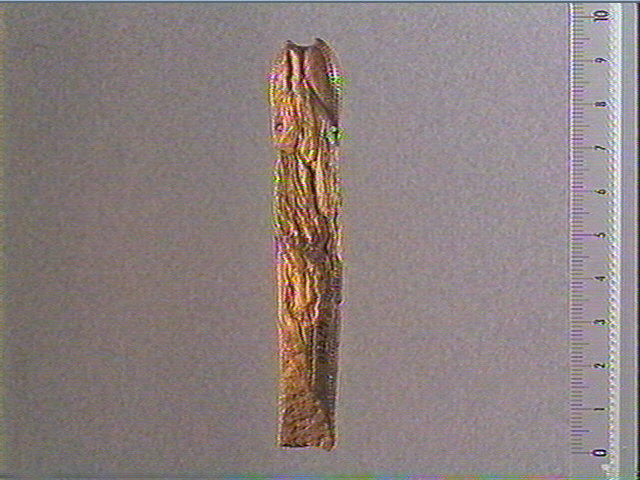 Objet phallique. A une extrémité, deux reliefs ellipsoïdaux latéraux portent un semis de pointillés. A leur base, deux perforations, et il y en avait sans doute une troisième au sommet, actuellement fracturée en partie. Sur chaque face, des rainures longitudinales, transversales et en chevrons portent de minuscules reliefs triangulaires
