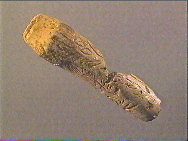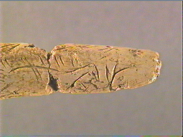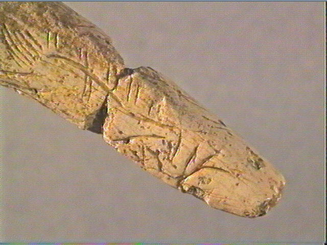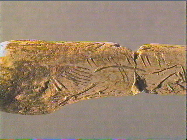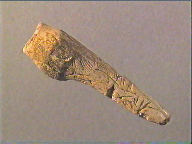 Sur une face, la gravure d'un échassier, probablement une grue, est fracturée. On distingue nettement le corps de l'oiseau avec le bec, le cou, les plumes, les pattes. Devant le bec, un motif énigmatique fait d'une ligne courbe et d'une ligne angulaire. Autour du dos de l'oiseau, 5 doubles courtes stries. De l'autre côté de l'objet, peut-être une ramure de cervidé. La pièce a été fracturée dans la partie médio/distale. L'extrémité distale est amincie. Le tissu interne du bois a été évidé dans la partie proximale.