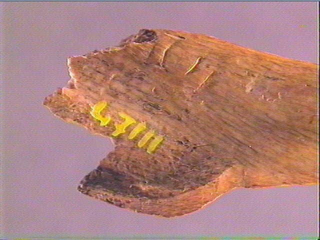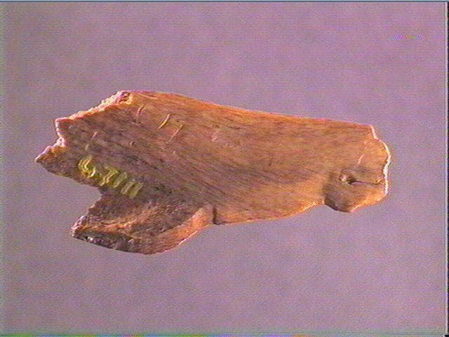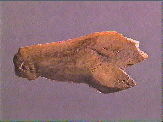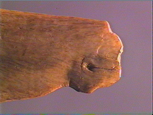 Tête de cheval découpée et gravée. L'oeil de la face gauche est en léger relief (l'autre est gravé), il est souligné par une rangée de stries fines. Le naseau et le sillon palpébral sont gravés légèrement.
