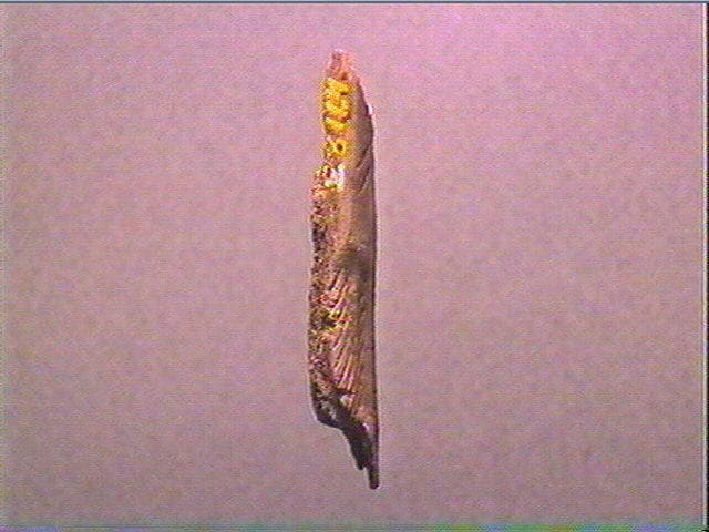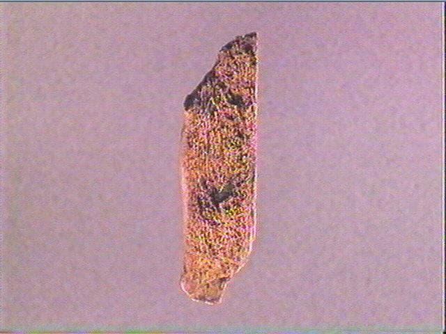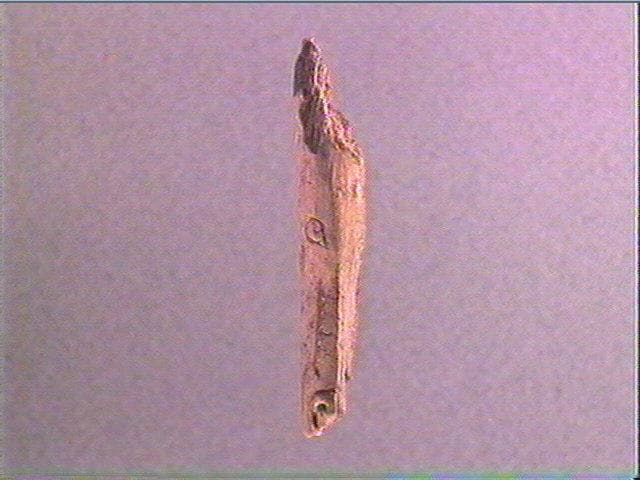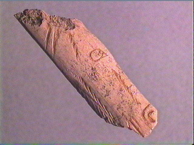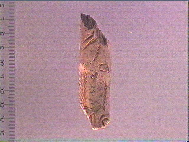 Tête de cheval découpée et gravée en incision profonde. C'est presque une ronde-bosse aplatie. Les naseaux sont traités en relief par gravure très profonde. Il y a dix stries pour la mâchoire, huit pour la joue, quatre au-dessus de l'oeil, sept sur le chanfrein. Le chanfrein a été indiqué par un polissage de l'os. Le front est bombé.