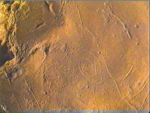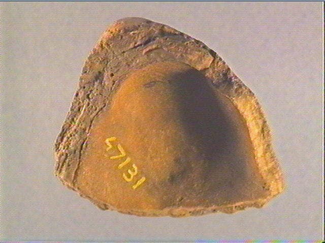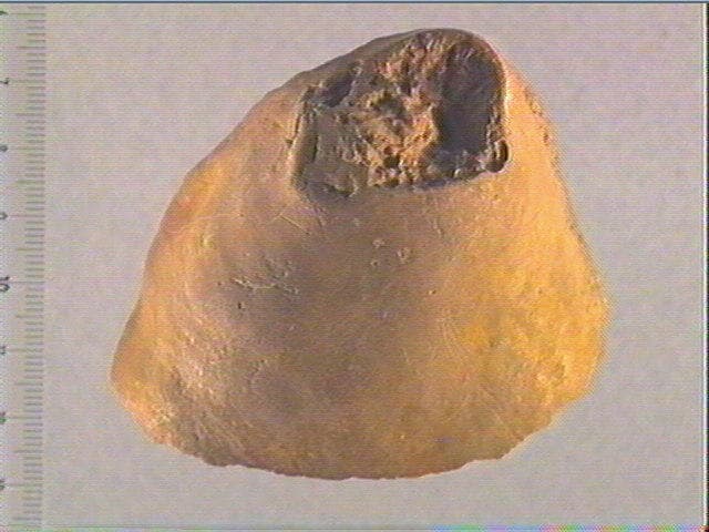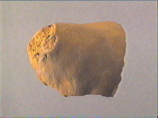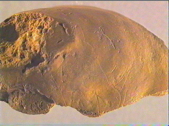 Incision en v, incision dissymétrique, incision symétrique, incision en u. Tête large d'un animal indéterminé, de profil droit, peut-être un cheval. Pour Breuil, il pourrait s'agir d'un rhinocéros. L'oeil est bien dessiné avec l'arcade sourcilière, le museau est très large et le naseau est représenté.