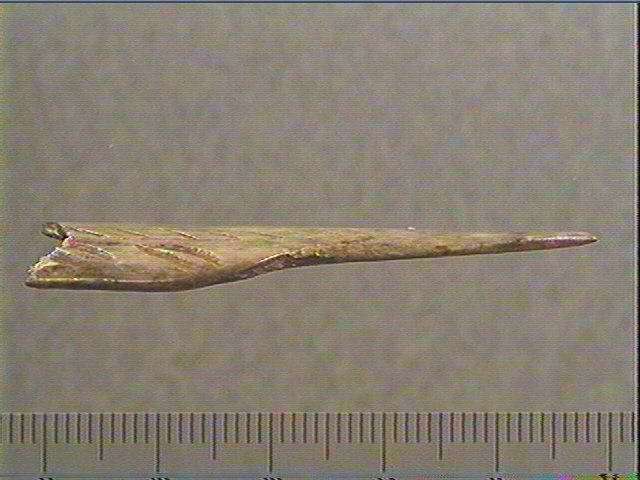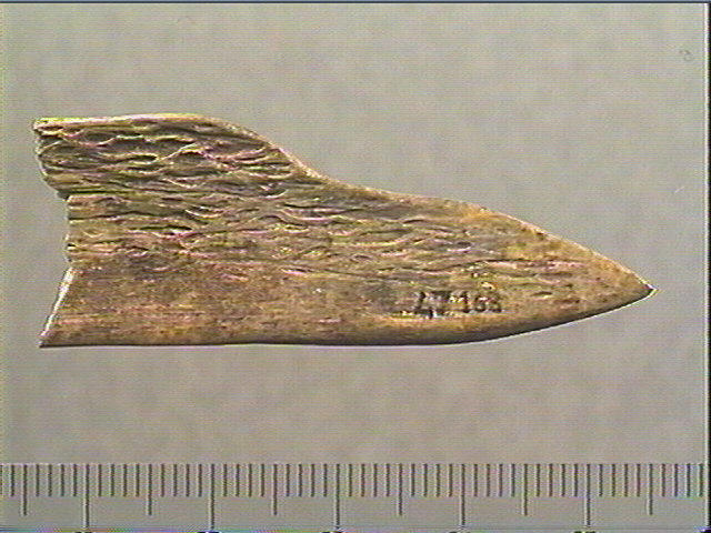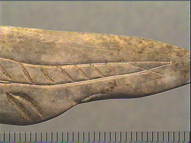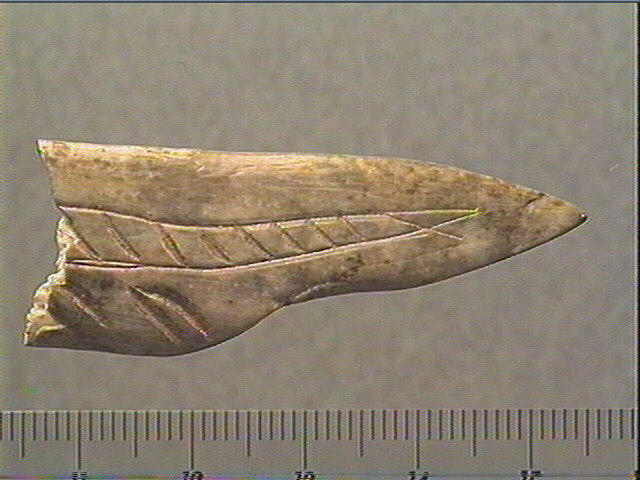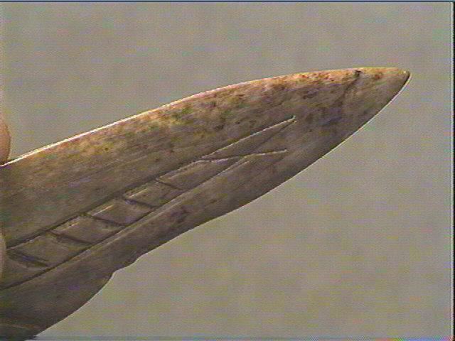 Incision en v dissymétrique moyenne, incision en v dissymétrique profonde. Peut-être une antilope gravée, avec sa corne annelée. Deux motifs fusiformes gravés.