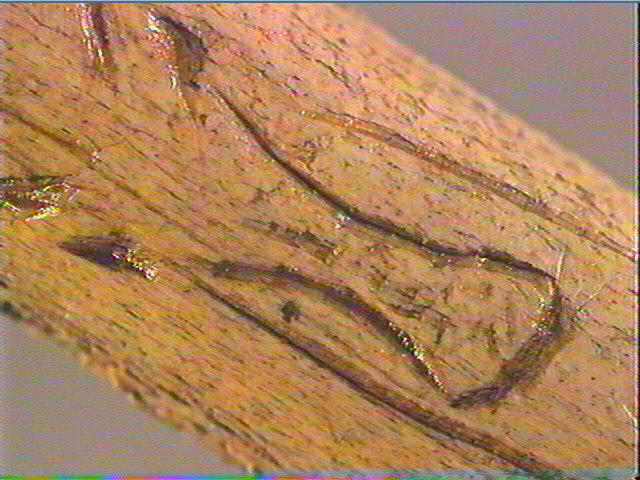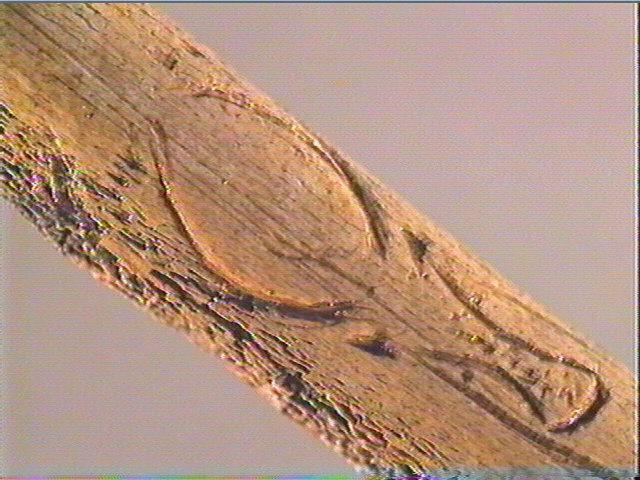 Elan gravé ; vue de face, tête, cornes. Chevrons emboîtés, gravés.