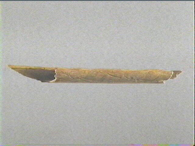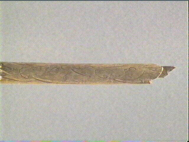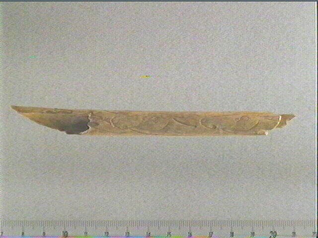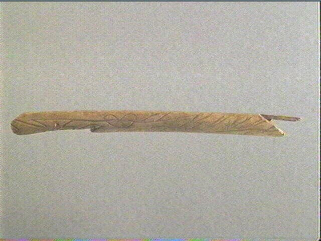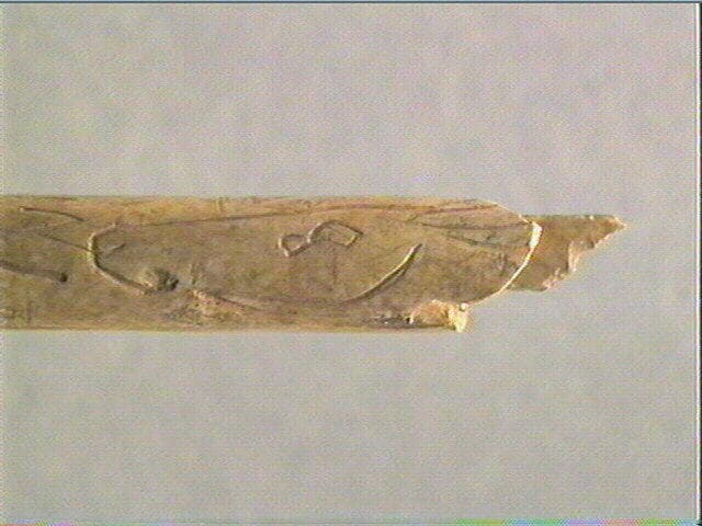 Frise de trois têtes de biche gravées de profil gauche dont une au niveau de la fracture. Les têtes sont étirées, les yeux très fortement incisés avec le canal lacrymal, et les oreilles et les naseaux sont bien marqués. Au-dessus, se trouve décor géométrique complexe dont une figure fermée cordiforme, des lignes courbes et des groupes de lignes obliques.