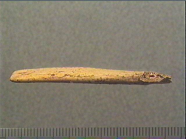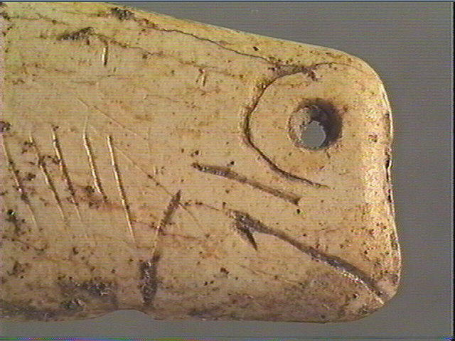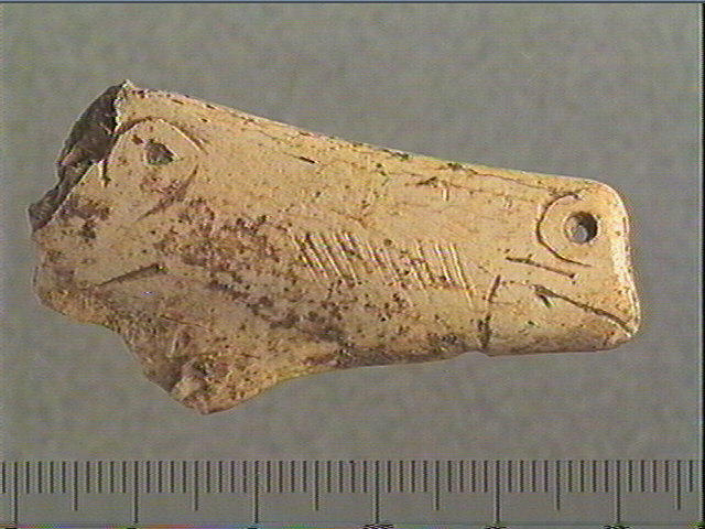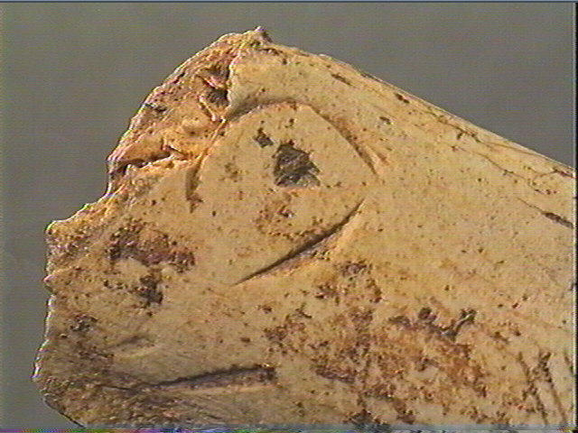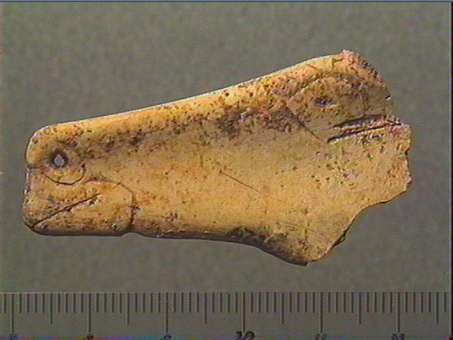 Incision en v dissymétrique moyenne. Tête de cheval découpée, gravée et perforée : oeil et paupières, museau carré, narine perforée, bouche en crochet, joue ombrée.