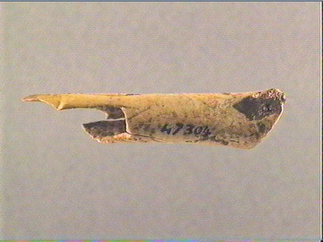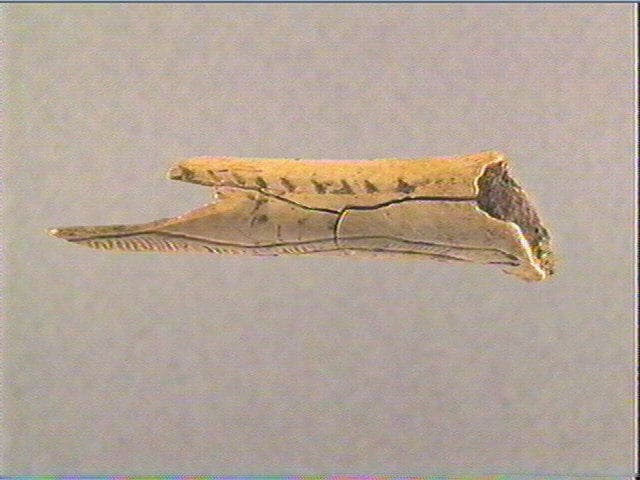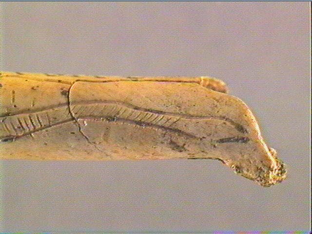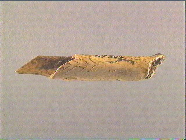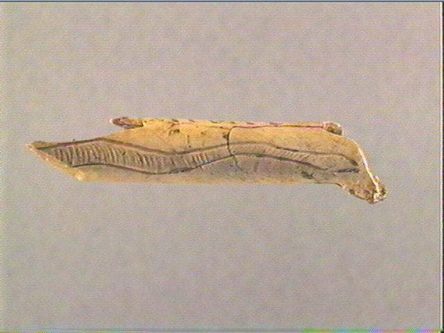 Sur une face : un serpent a été gravé, tourné vers la droite et marqué de fines stries obliques près de la tête et de lignes transversales plus profondes sur le corps. De l'autre côté, quatre chevrons emboîtés. Une rainure longitudinale peu profonde porte des stries obliques parallèles.