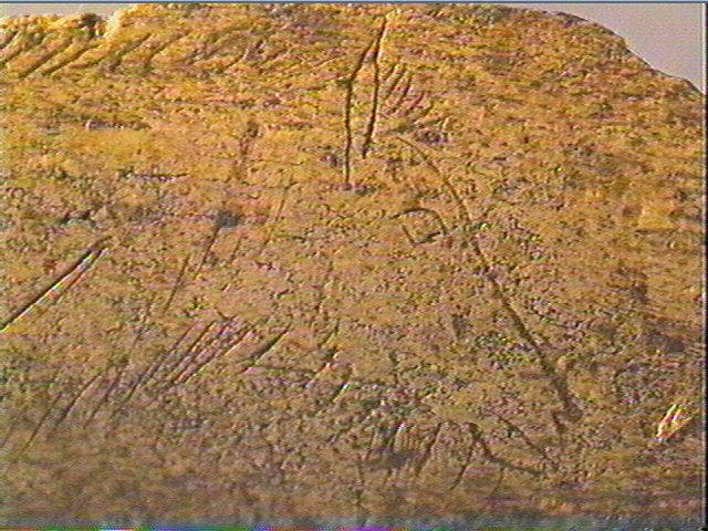 Cheval gravé de profil, droit, debout. Le pelage est largement représenté. L'oreille est dressée, la crinière, l'oeil en amande, le museau, le naseau, la bouche, le menton, la ganache sont dessinés. La queue est longue et écartée.