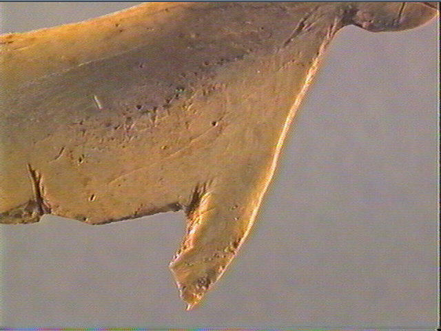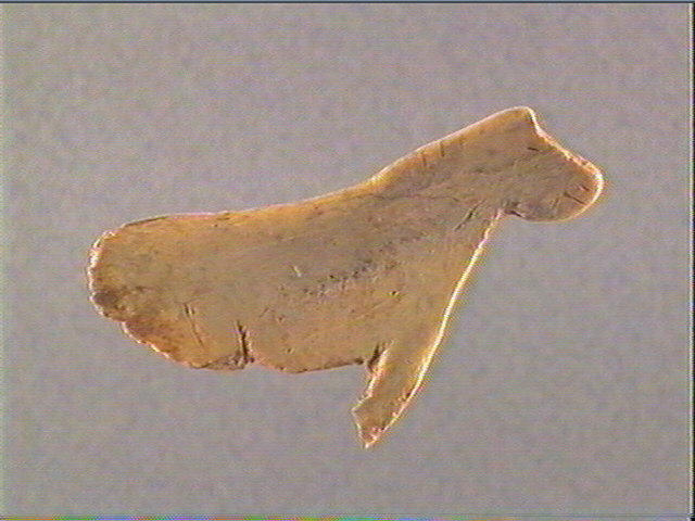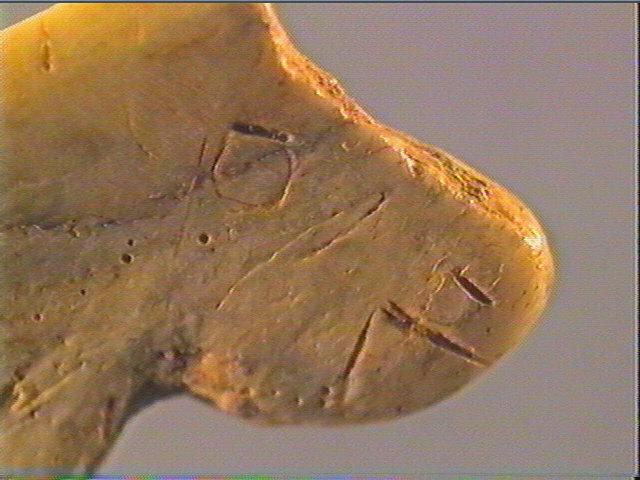 Cheval découpé et gravé : petite tête, oeil quadrangulaire sur le de profil, droit et circulaire sur le de profil, gauche, museau large, naseau, bouche, crinière, oreille gauche, patte antérieure et patte postérieure fracturées.