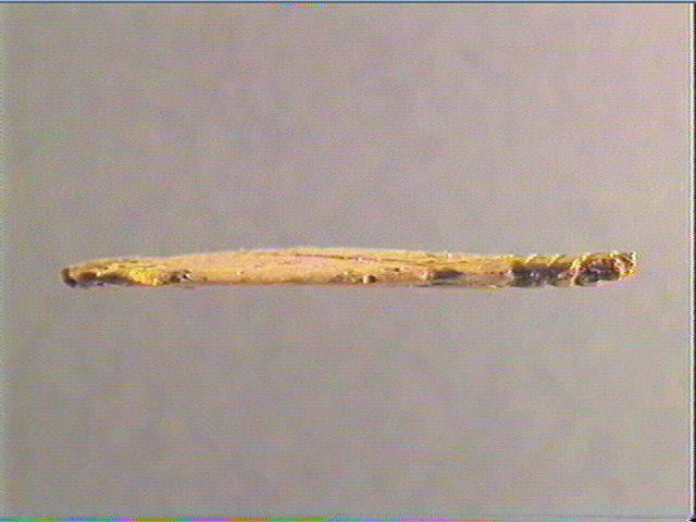 Tête de bouquetin découpée et gravée dont il reste l' oeil circulaire, prolongé en pointe par la caroncule lacrymale et souligné par un trait, la corne annelée, le museau, le naseau, la bouche ouverte, le menton et la ganache.