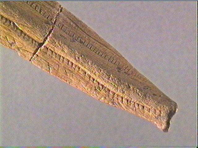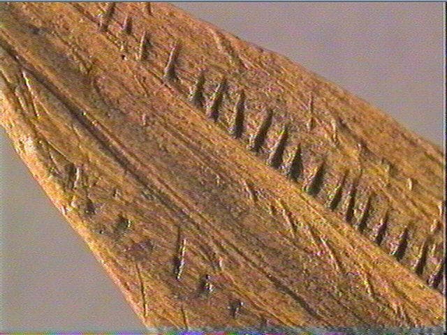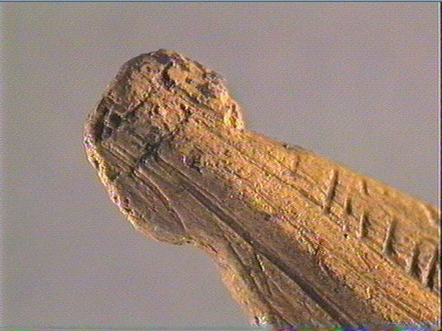 Corps de vipère sculpté et gravé ? L'arrondi de la pièce, à une extrémité, formerait la tête du serpent. Une bande centrale a été dégagée. Elle est ornée de quelques courtes stries obliques et, de chaque côté, d'une ligne de courtes stries transversales.