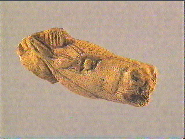 Incision en v symétrique profonde, incision en v dissymétrique profonde, incision fine, coloration rouge (hématite et feldspath). Cette sculpture représente une tête de cheval dite 'hennissant'. La pièce est entièrement sculptée, il est possible qu'il s'agisse d'un fragment appartenant à un objet plus grand, propulseur ou de bâton percé. De nombreux détails anatomiques sont représentés sur le de profil, gauche : orbite, museau, naseau, bouche ouverte, oreille. Registres, chevrons emboîtés et traits parallèles soulignent les volumes et les creux.