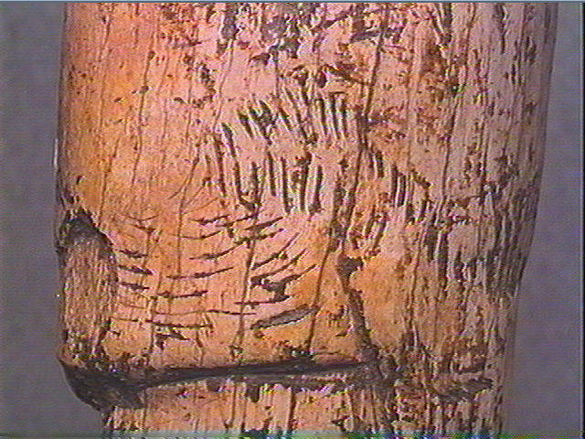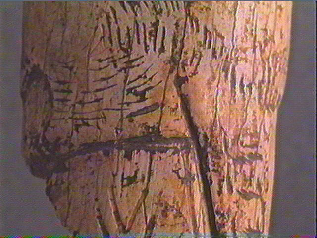 Incision en v dissymétrique moyenne, incision en u large, incision fine. Partie antérieure du corps d'un herbivore, sculptée et gravée : de profil, droit, poitrail, ventre, pelage en bandes hachurées, épaule portant trois signes barbelés à un rang de barbelulures, patte antérieure. Au-dessous : 2 chevrons emboîtés. Traits transversaux et obliques alignés.