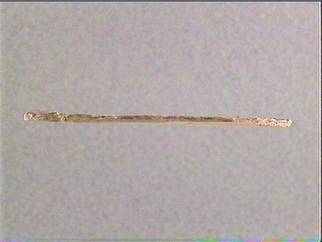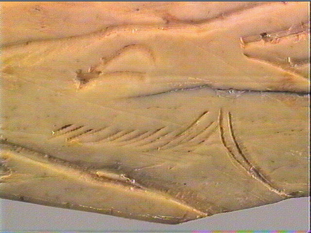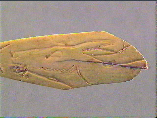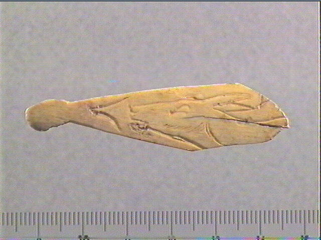 Sur la face plane, supérieure, tête de biche gravée : de profil, gauche, oreille, oeil en amande, joue soulignée par des stries parallèles, museau, naseau, bouche entrouverte, cou. Devant : motif angulaire.
