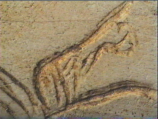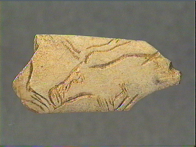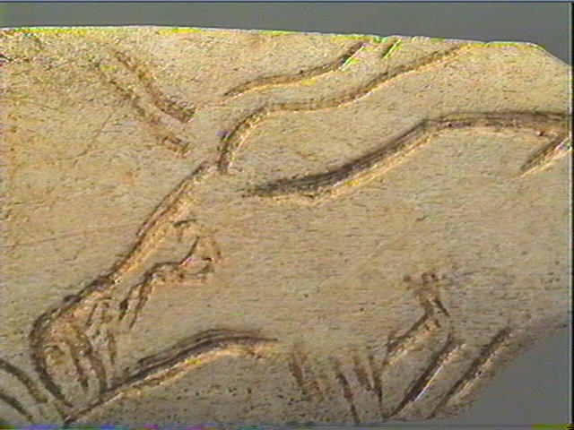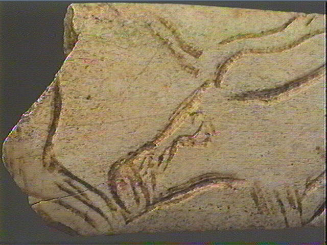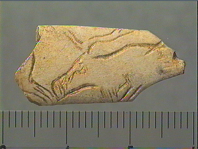Incision fine, incision en v dissymétrique moyenne. Ce petit fragment de lissoir porte, sur une face, une gravure de renne dont il ne reste que l'avant-train : profil gauche, bois ramifiés, poitrail, pattes antérieures, tête, oeil, museau carré. Devant le renne, se trouve un autre animal dont il ne reste que les pattes arrières et une partie de la croupe.