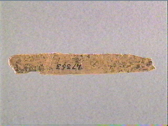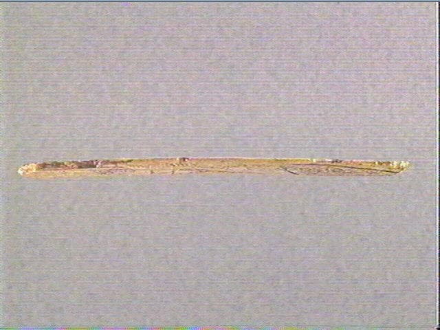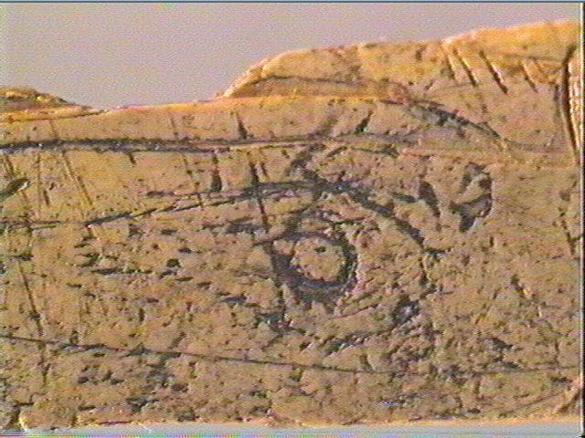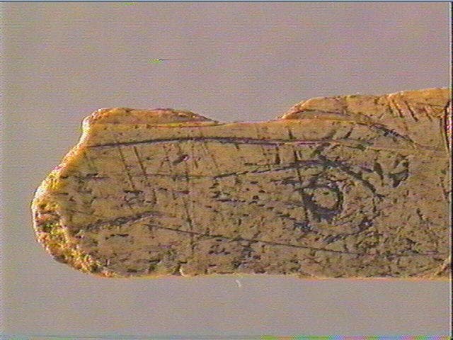 Incision fine, incision en v moyenne, incision en v profonde. Sur une face, cheval gravé : profil gauche, tête très fragmentaire, chanfrein rectiligne, oeil allongé, bande transversale, rayée au niveau de l'encolure, puis formant un damier, crinière, ligne oblique bordée de stries au niveau de la ligne cervicale. A droite, une ligne oblique et une zone couverte de petites cercles faits de courts traits parallèles.