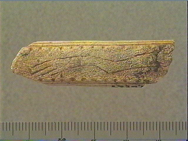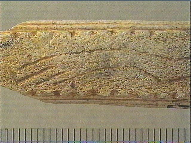 Incision en v dissymétrique moyenne. Bras humain ? gravé : bras, avant bras, main, doigts. De part et d'autre : rangée de tubercules et double ligne longitudinale.