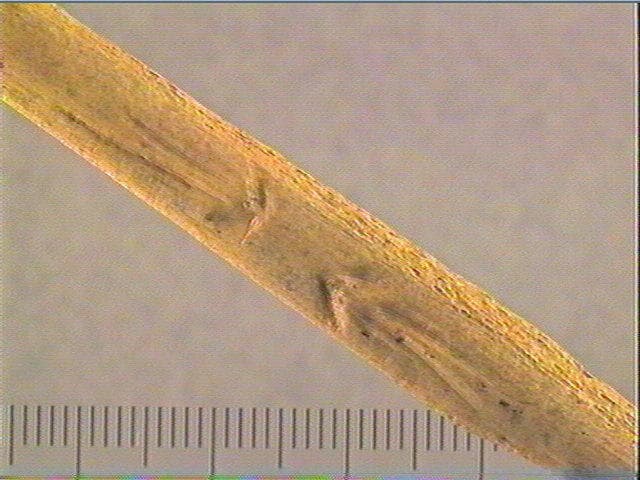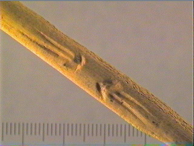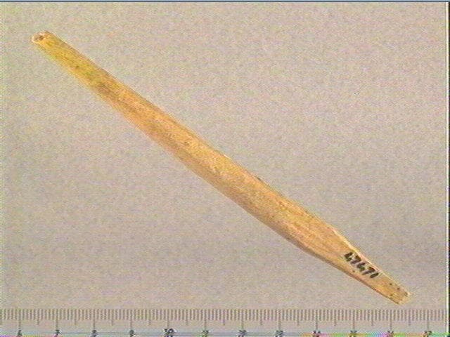 Traces de façonnage. Incision en v. Sur une côté : deux motifs opposés formés d'un court chevron accolé à 2 rainures longitudinales. Breuil y voyait une tête de cervidé stylisée.