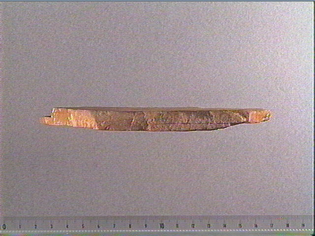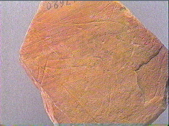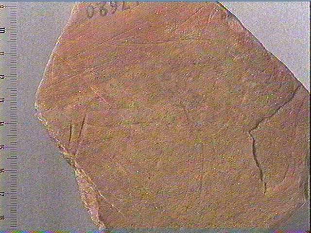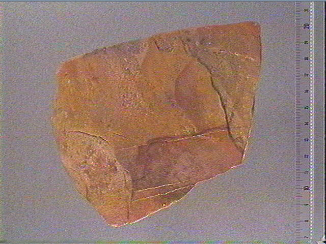 Incision en v dissymétrique moyenne, incision en v dissymétrique profonde. Corps d'un animal gravé debout, de de profil : gauche. Il s'agit probablement d'un cervidé. Il manque la partie antérieure qui a été fracturée. L'arrière-train présente une croupe, une queue courte, les pattes postérieures dont une bien finie avec le sabot et l'ergot. La ligne du ventre est double, la patte antérieure est en partie visible.