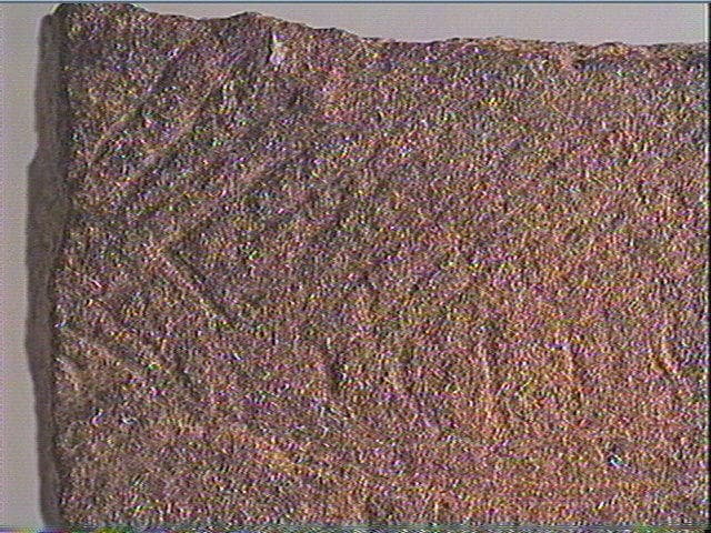 Incision en v dissymétrique, incision simple, incision double. Tête de canidé (?) gravé, de profil droit, oeil en amande, museau allongé, naseau, bouche, le chanfrein est repris. Au-dessus, long trait courbe et ligne de chevrons emboîtés suivant le chanfrein.